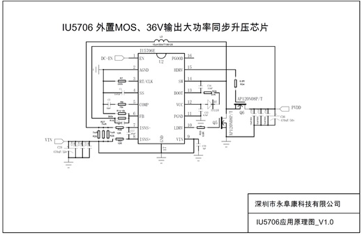 深圳市永阜康科技有限公司現在大力推廣一顆外置MOS,36V輸出大功率同步升壓控制器-IU5706. 4.5V 到30V寬范圍輸入,適用于不同類型的電池及電源輸入;輸出電壓最高38V;可驅動大電流MOSFET,滿足100-300W大功率的應用要求;50KHz至1MHz的可調頻率,同時提供外部時鐘同步,EMI設計更為靈活;6μA關斷電源電流,720μA靜態工作電流;采用EQA-16小封裝,整體方案尺寸小,設計簡單,BOM成本低。