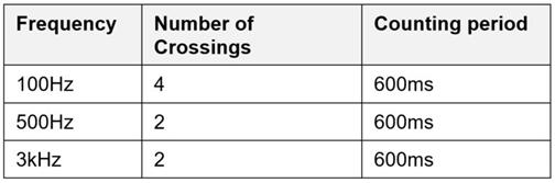 音頻信號檢測的基本原理如圖 1所示。系統設計考慮三個參考頻率:100 Hz、500 Hz 和 3 kHz。對于給定的信號,系統計算在一定時間內該信號的頻率與參考頻率交叉的次數。僅考慮從低頻到高頻的交叉;例如,50 Hz 至 150 Hz 將計入 100 Hz,而 150 Hz 至 50 Hz 則不計入 100 Hz。如果信號與兩個參考頻率中的任意一個交叉的次數達到表 1中指定的少次數,則設計會將信號視為音頻。