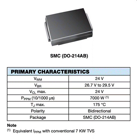 在每一個電池組、每一個電池簇與外部的連接電路中,都會有二極管的存在,通過其單向導通的能力來確保通信接口不受到損壞;同時在多種電路拓撲中,也都需要二極管的參與。在此我們為大家推薦一款來自Vishay的二極管器件,非常適用于儲能系統BMS的應用。該器件名為XMC7K24CA XClampR™ TVS二極管,在貿澤電子的具體料號為“XMC7K24CA-M3/H”。