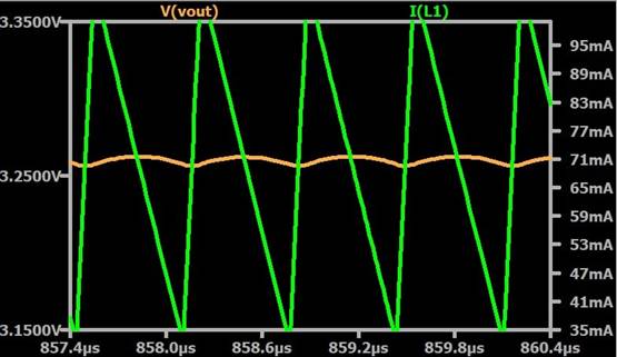 解決這個問題后,我們來考慮一下 V OUT。我們的預期輸出電壓為 3.3 V,模擬電路的 V OUT為 3.26 V。占空比計算中所需的效率項是一個較小誤差的該項通過開關的占空比直接影響電路行為- 控制波形,并且 90% 的假設值并不在所有情況下都是準確的。