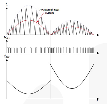 圖 4 顯示了 MOSFET 導通時間和開關頻率如何隨著輸出功率降低而變化。當負載減小時,如圖 4 右側所示,峰值電感器電流會隨著 MOSFET 導通時間的縮短而減小,因此開關頻率會增加。由于這會在輕負載條件下導致嚴重的開關損耗,并且啟動時可能會出現過高的開關頻率操作,因此 FL7930B 的開關頻率被限制為 300kHz。由于具有可變開關頻率的 BCM PFC 轉換器的濾波器和電感器的設計應在頻率條件下進行,因此值得研究 BCM PFC 轉換器的頻率如何隨工作條件變化。