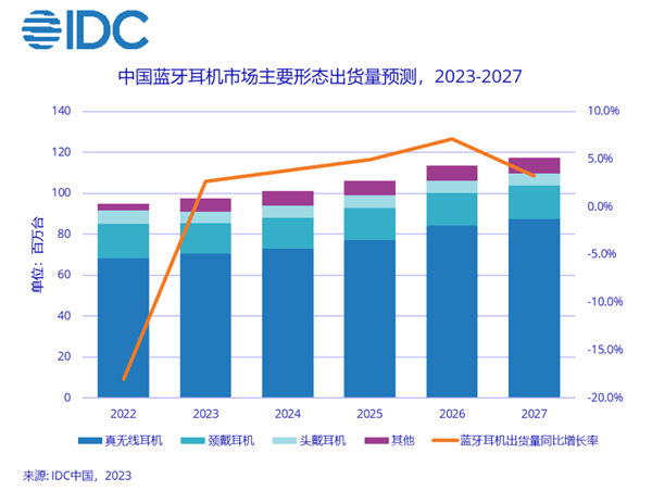 IDC預(yù)計(jì),2023年中國(guó)藍(lán)牙耳機(jī)市場(chǎng)出貨量將達(dá)到9,486萬(wàn)臺(tái),同比增長(zhǎng)2.7%,其中真無(wú)線耳機(jī)市場(chǎng)出貨量7,047萬(wàn)臺(tái),同比增長(zhǎng)3.3%。