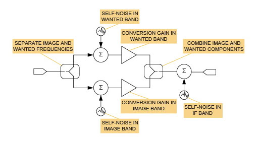 當(dāng)混頻器是信號(hào)鏈的一部分時(shí),噪聲系數(shù)分析的主要困難就會(huì)出現(xiàn)。所有實(shí)際混頻器都會(huì)圍繞本地振蕩器 (LO) 頻率折疊 RF 頻譜,根據(jù) fOUT = |fRF – fLO| 創(chuàng)建包含兩側(cè)頻譜總和的輸出。在外差架構(gòu)中,這些貢獻(xiàn)之一通常被認(rèn)為是虛假的,而另一個(gè)則被認(rèn)為是有意的。因此,圖像拒絕過(guò)濾或圖像消除方案可能被用來(lái)很大程度上消除這些響應(yīng)之一。在直接轉(zhuǎn)換接收器中,情況有所不同;兩個(gè)邊帶(高于和低于 fRF = fLO)均被轉(zhuǎn)換并用于所需信號(hào)。因此,這確實(shí)是混頻器的雙邊帶 (DSB) 應(yīng)用。