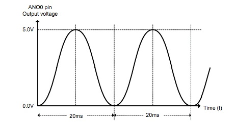 使用 D/A 轉(zhuǎn)換器從 ANO0 引腳輸出模擬電壓。模擬電壓輸出從 0.0 V 開始。輸出電平每 200 ?s 變化,正弦波形為 50 Hz(1 個周期:20 ms)