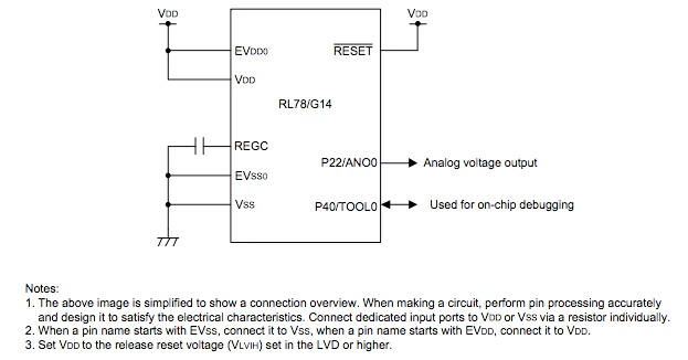使用 DAC0 從 ANO0 引腳輸出模擬電壓。DAC0 轉(zhuǎn)換操作啟用后,模擬輸出電壓立即為 0.0 V。在間隔定時器模式下使用 TAU0 通道 0 (TAU00),并每 200 ?s 生成中斷。通過 TAU00 計數(shù)結(jié)束中斷啟動使用 ELC 的 DAC0 的模擬輸出電壓轉(zhuǎn)換。同時啟動 DTC,并將 D/A 轉(zhuǎn)換值表中存儲的值傳送到 D/A 轉(zhuǎn)換值設(shè)置寄存器 0(DACS0)。