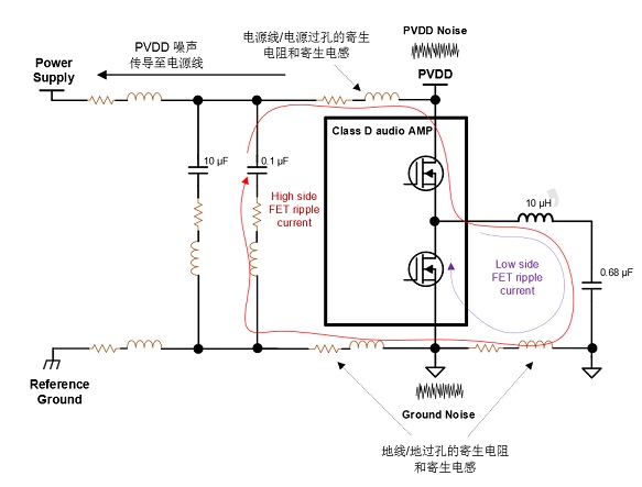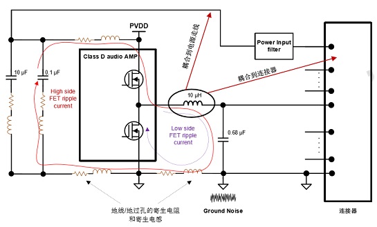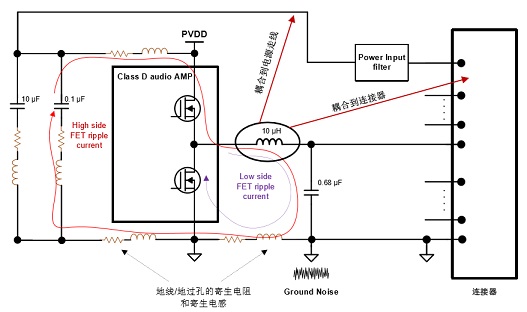 地噪聲來(lái)源分析:由于開(kāi)關(guān)紋波電 流流過(guò)寄生電感/電阻,造成參考地(Reference Ground)和功放地之間的電壓偏差。地噪聲會(huì)通過(guò)音頻功放傳導(dǎo)至喇叭線(或者其他 走線)影響傳導(dǎo)/輻射測(cè)試結(jié)果。