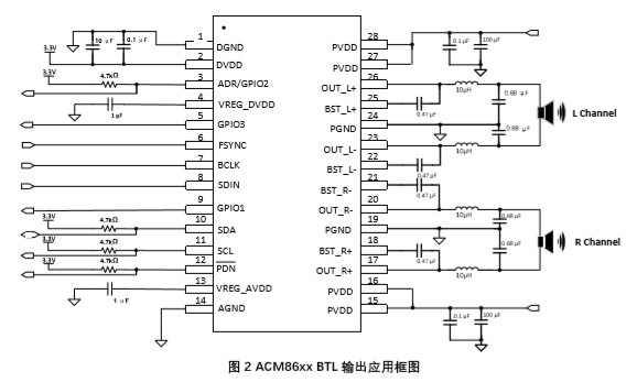 圖2為ACM86xx 數(shù)字功放典型BTL輸出應(yīng)用框圖