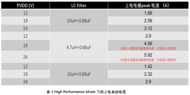 在此處PVDD為功放供電電壓 Duty為無輸入信號時的PWM輸出Duty Cycle,即占空比下表列出了不同供電電壓下不同LC Filter上電啟動時電感上的電流: