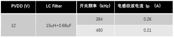 開關(guān)頻率越高,紋波電流越小,電感越大,紋波電流越小。一般為了降低音頻功放自身的開關(guān)損耗,推薦開關(guān)頻率采用480kHz,因此一般建議電感在PVDD大于12V的應(yīng)用情況下,電感值不要低于10uH。