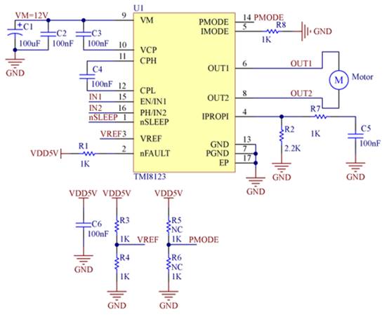 TMI8123內建電流檢測功能,無需外部功率電阻即可實現精確電流采樣,節省PCB面積。在電機失速或高轉矩事件的情況下限制輸出電流,并通過通過Ripropi將IPROPI引腳流出的比例電流轉換為電壓,實現對負載電流的實時檢測。
