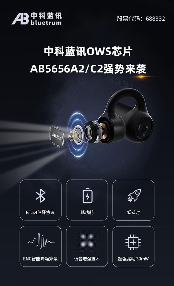 中科藍訊推出新款應用于無線藍牙耳機的藍牙音頻芯片AB5656A2/C2,支持藍牙5.4連接協議,適用于OWS耳機。