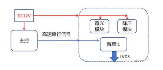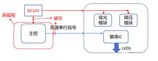 客戶的產品為一個顯示屏驅動電路,通過將主控傳輸過來的高速串行信號進行解碼,再傳送到顯示屏。主要模塊分為三部分,一個是背光升壓模塊,用于給背光供電,開關頻率為2.2MHz,一個是降壓模塊,給解串IC供電,開關頻率為500KHz,另一個是信號解串模塊,解串后輸出LVDS時鐘頻率為48MHz。簡單電路框架如下: