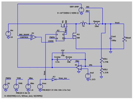 圖 1.峰值 CMC 降壓轉(zhuǎn)換器的 LTspice 原理圖。