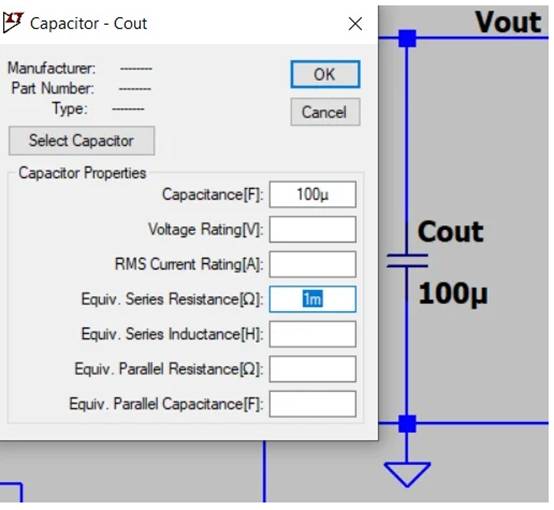 LTspice 窗口顯示 CMC 降壓轉(zhuǎn)換器仿真的輸出電容值。 電容為 100 F,包含 1 mΩ ESR。