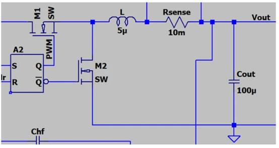 M1、M2、L、R SENSE和C OUT屬于功率級。請注意,C OUT值(圖 2)包括 1 mΩ 的ESR。