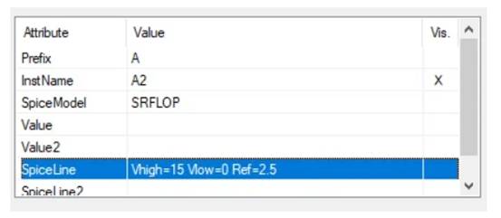 顯示 SRFLOP 值的 LTspice 窗口。 它顯示邏輯高電壓等于 15 V,邏輯低電壓等于 0 V。