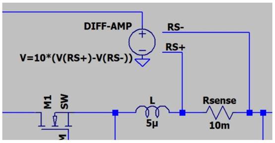 通過放大與電感器 ( L )串聯(lián)的電流檢測電阻器 ( R SENSE ) 兩端的電壓來生成電流反饋信號。為了方便起見,我使用任意行為電壓源 (DIFF-AMP),而不是 SPICE 版本的差分放大器。DIFF-AMP 輸出等于R SENSE兩端的電壓乘以 10。