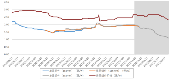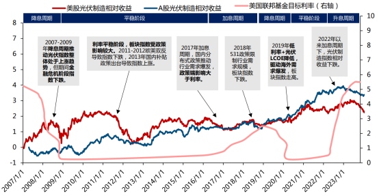 復盤歷史,2019年,光伏板塊指數(shù)靠著光伏平價帶來行業(yè)市場化拐點和降息帶來的融資成本下降刺激海外需求上升兩大因素持續(xù)走高。然而,歷史總是驚人的相似。如今產(chǎn)能過剩促使光伏組件價格加速下跌,甚至跌破部分成本價,帶動光伏LCOE再次降低;美聯(lián)儲也會在2024年開始新一輪降息周期。兩因素的疊加會大大增加光伏電站的收益率,促使光伏電站加速建設。