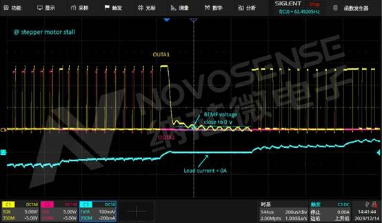 步進(jìn)電機(jī)在運(yùn)行狀態(tài)下,反電勢(shì)和相電流存在特定關(guān)系,可以反應(yīng)步進(jìn)電機(jī)的運(yùn)行狀態(tài)。NSD8381-Q1內(nèi)置點(diǎn)電機(jī)的反電勢(shì)檢測(cè)模塊,會(huì)在每個(gè)周期的電流過(guò)零點(diǎn),對(duì)電機(jī)反電勢(shì)進(jìn)行采樣。通過(guò)反電勢(shì)電壓和內(nèi)置閾值電壓對(duì)比,判斷電機(jī)運(yùn)行狀態(tài)。