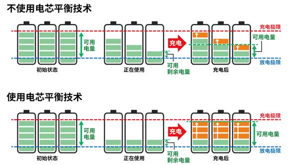 另一種是主動方式:在容量和電壓不平衡的相鄰電芯之間流過電流使電芯的充電狀態(tài)實現(xiàn)均等。為了將電池的潛在能力用盡,需要采用主動方式。