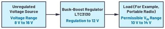 圖1所示為這類應(yīng)用的系統(tǒng)示意圖。便攜式無線電設(shè)備由電池提供電壓。負(fù)載可以接受介于10 V和14 V之間的電壓,但電壓源的輸出范圍可能為8 V至16 V。那么內(nèi)插的降壓-升壓穩(wěn)壓器可以在輸出端將電壓轉(zhuǎn)換為12 V。如果電源電壓略低于12 V,轉(zhuǎn)換器采用升壓模式工作,如果電源電壓高于12 V,則采用降壓模式工作。