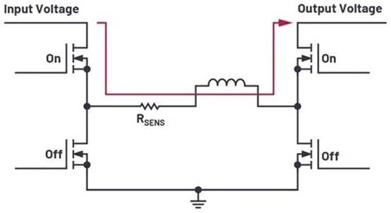 圖2所示為配有直通模式的新 LT8210 降壓-升壓控制器電路的功率級。在這種模式下,H橋的兩個高端開關(guān)永久開啟,兩個低端開關(guān)永久關(guān)閉。通過這種方式,根據(jù)電流和電壓情況,可以實現(xiàn)近乎100%的效率。