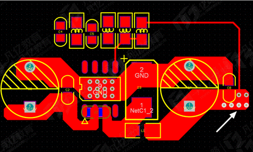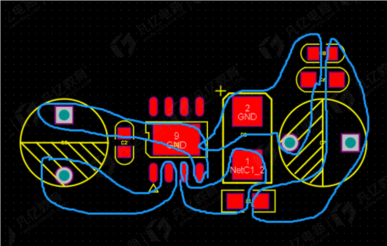 17.輸入以及輸出地連接之后統一在IC扇熱焊盤上面打孔即可