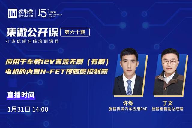 1月31日下午14點,集微網舉辦第60期“集微公開課”活動,特邀旋智電子科技(上海)有限公司(簡稱旋智科技)銷售副總經理丁文和資深汽車應用FAE許爍,為大家分享主題為” 應用于車載12V直流無刷(有刷)電機的內置N-FET預驅微控制器”的在線直播講解,以闡述該產品的技術知識、解決方案和旋智科技研發的核心功能特性。