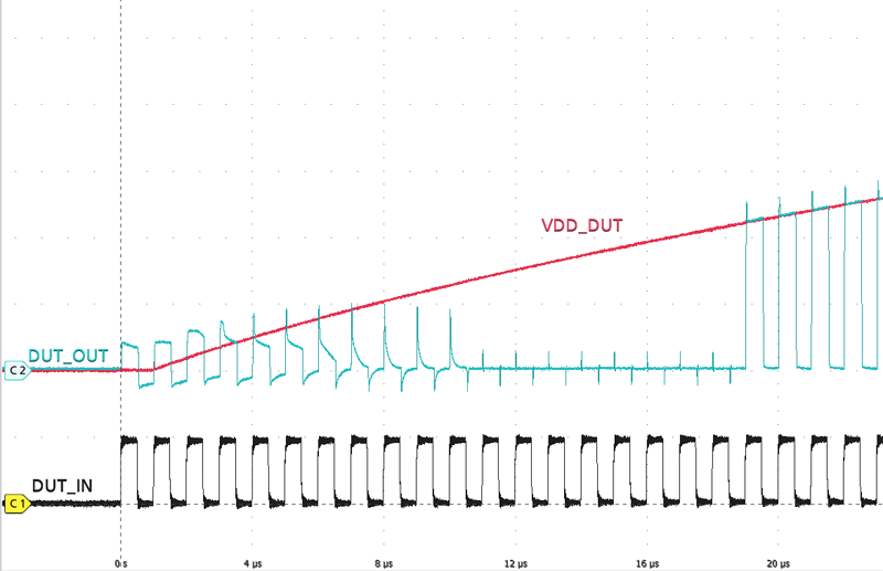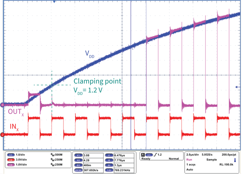 圖4所示為EiceDRIVERTM 2EDN輸出電壓有源箝位性能報告。驅動器VDD電源電壓一經達到1.2V,輸出電壓有源箝位機制就會被激活,OUT引腳會在大約20ns激活時間內被主動下拉至安全關斷電平。其反應速度比無源箝位機制的RC時間常數快得多,后者可能需要數十微秒甚或更長時間。