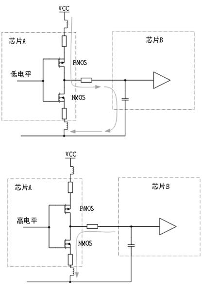 (2)芯片外部電源引腳提供給內部晶體管一個公共的電源節點,當晶體管狀態轉換時必然引起電源噪聲在芯片內部傳遞。
