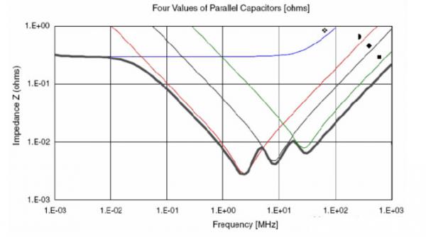 用一個電容組合的例子。這個組合使用的電容為:2個680uf鉭電容,7個2.2uf陶瓷電容(0805封裝),13個0.22uf陶瓷電容(0603封裝),26個0.022uf陶瓷電容(0402)。圖中上部平坦的曲線是680uf電容的阻抗曲線,其它三個容值的曲線為為圖中三個V字曲線,從左到右2.2uf →0.22uf→ 0.022uf。總的阻抗曲線為底部粗包路線。