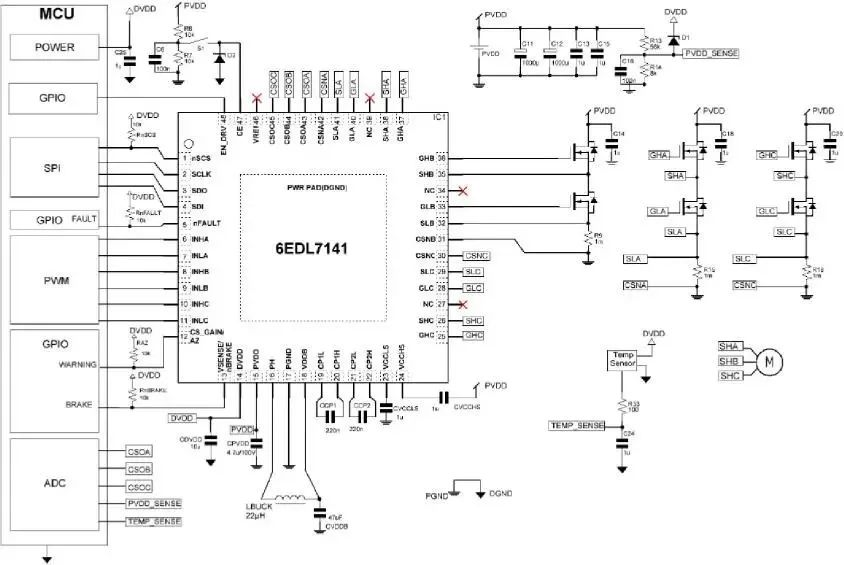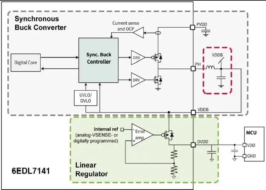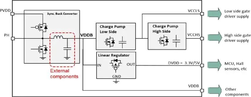圖 3、圖 4 可以看到,MOTIX™ 6EDL7141 內(nèi)部集成高效同步 Buck DC-DC 轉(zhuǎn)換器為整個系統(tǒng)提供高壓供電,輸入電壓范圍寬至 5.5-60V,如果當 PVDD ≥9.5V,VDDB 能夠提供高達 600mA 的電流,同時配備由Buck 轉(zhuǎn)換器輸出供電的 LDO 穩(wěn)壓器可提供高達 300mA 的低噪聲數(shù)字電源。作為系統(tǒng)級設(shè)計時,可以靈活選擇供電方式,如:Buck 或 LDO 輸出為外部組件(MCU、霍爾等)供電,為配套的 MCU 提供電源,從而省去了所需要的電源配置。