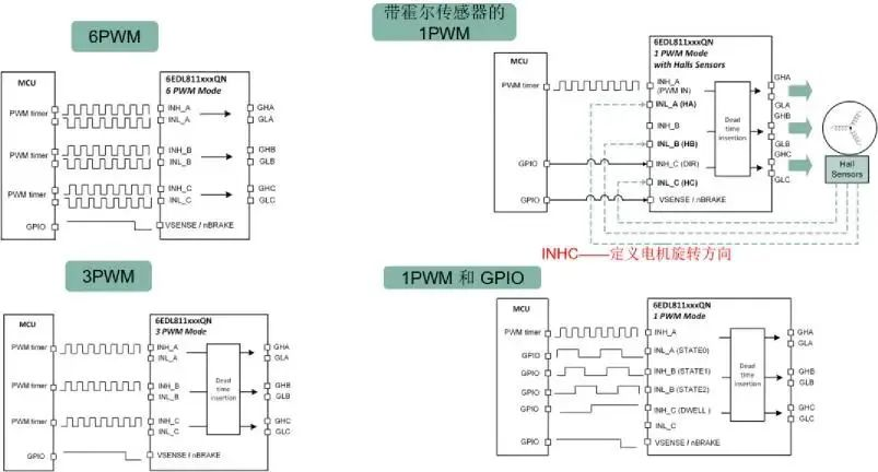 6EDL7141 提供 4 種不同的 PWM 模式和一個變種模式,以滿足不同的 MCU 需求。第一種模式是 6 PWM 模式,通過使用來自 MCU 的 6 個 PWM 信號以最經(jīng)典方式驅(qū)動?xùn)艠O驅(qū)動器。