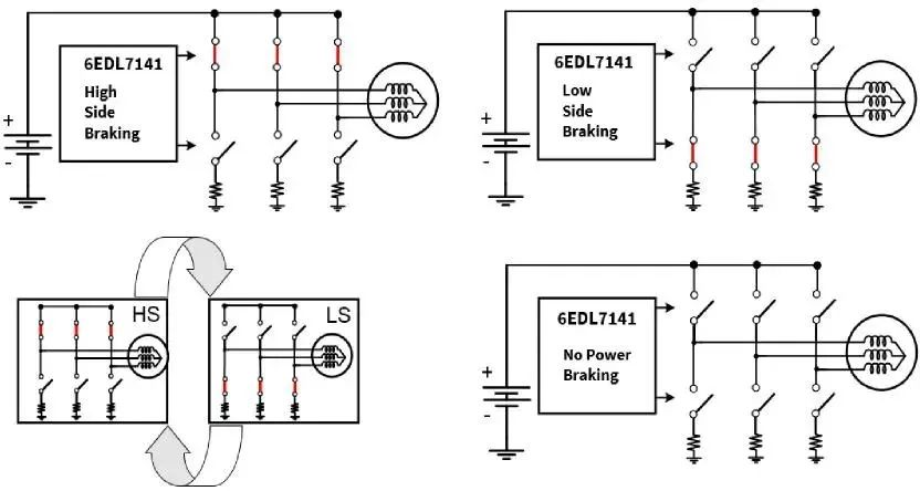 而在制動時,6EDL7141 將在制動事件發(fā)生時將柵極驅(qū)動器輸出設(shè)置為預(yù)定義狀態(tài),在與 XMC1400 或其他 MCU 集成時,可以通過內(nèi)部和外部的雙重制動,來提高系統(tǒng)的可靠性。外部的制動即是由外部 MCU 或系統(tǒng)中的任何其他故障源處理。6EDL7141提供以下幾種制動模式,如圖6所示。