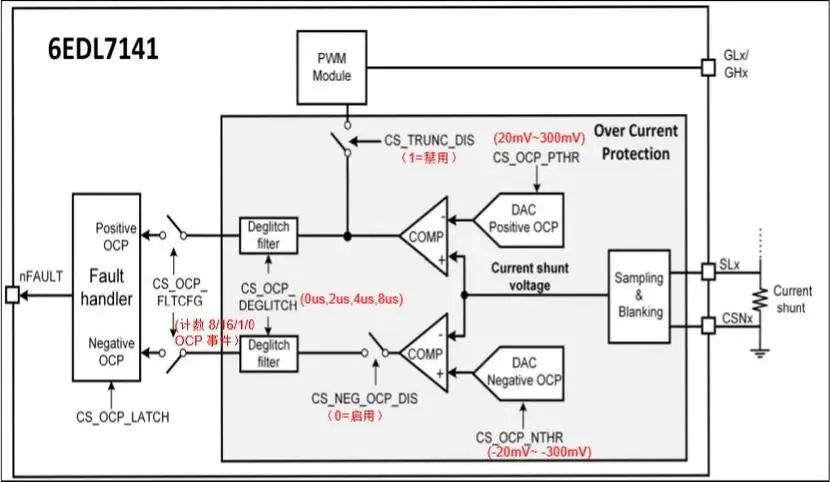 其中 OCP 過流保護是電機應(yīng)用中一個極為重要的保護特性, 6EDL7174 其內(nèi)部的 OCP 比較器機制具有集成高精確的 DAC 參考電壓,正 OCP 和負 OCP 功能,PWM 截斷,帶抗尖峰脈沖定時器,故障觸發(fā)事件配置等。當然 OCP 過電流保護也存在如下位置:如在分流或 Rdson,DVDD,LDO OCP,降壓轉(zhuǎn)換器 OCP 等位置。同時芯片供電的 UVLO 也沒有缺失,如 PVDD、柵極驅(qū)動器電源、DVDD LDO 的欠壓鎖定保護,以及系統(tǒng)層面的過溫報警和保護關(guān)斷,可配置看門狗、基于霍爾傳感器輸入的轉(zhuǎn)子鎖定檢測,存儲器故障這些一起為電機控制實現(xiàn)系統(tǒng)化集成保護,提升了電機系統(tǒng)的可靠性。