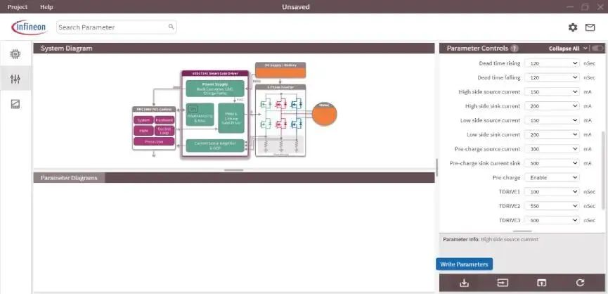英飛凌為電機驅(qū)動控制設(shè)計提供了 GUI 工具,用戶可以通過 GUI 界面實現(xiàn)器件的選擇,參數(shù)的任意配置,這些只需要通過參數(shù)寫入即可以實現(xiàn)可視化的參數(shù)配置和效果,大大簡化和節(jié)約設(shè)計時間。調(diào)節(jié)后的參數(shù)可以存儲在 OTP 中。完成 OTP 操作后,還可以通過 SPI 命令更改一些配置,6EDL7141 提供高達 50 個參數(shù)可以通過 SPI 配置。