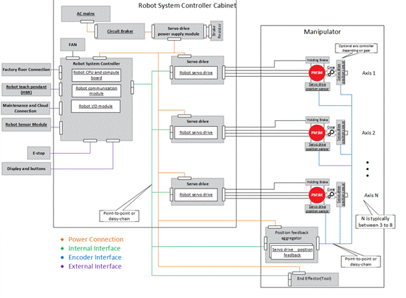 雖然集中式控制架構可以滿足重有效載荷工業機器人等大功率自動化系統的性能和效率設計要求,但這些系統需要使用額外電纜,連接機柜和關節的機械電機,以及位置傳感器和聚合器。這些電線不僅成本高昂,而且容易磨損,需要維護。