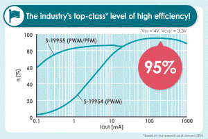 「S-19954/5系列」的高效率在功能相同產品中達到了業界最高水準(在輸入電壓4V、輸出電壓3.3V時為95%)的功率轉換效率。