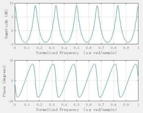 在頻域上,系統對頻率具有周期響應,且具備最大值與最小值,這樣我們將會得到像梳子一樣的波形圖,如下圖(圖4)所示,因此也被稱為梳狀濾波器。