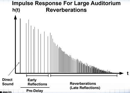 對于模擬現實生活的中混響,試想一下,如果我們在一個房間里面對面地交談,因為聲音在房間里面的反射是無處不在的,在開始溝通的過程中,會有最開始的一部分直達聲進入我們的耳朵,這時它的能量是最高的。隨后通過各種各樣的反射,聲音的能量得到衰減后慢慢進入到我們的耳朵,這個時間和能量的表現就像是一個個脈沖,所以在這里描述它就是脈沖響應類的其中一種混響。那么在實現上,如何達到這種接近現實的混響效果呢?