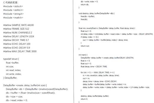 如上圖(圖14)所示的代碼是一個簡單的DSP混響效果實現,它使用了C語言進行編程。代碼主要有以下操作: