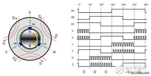 圖 1: BLDC 電機(jī)的供電方式是通過使用 PWM 信號(hào)順次激勵(lì)繞組。 PWM 信號(hào)的占空比與驅(qū)動(dòng)電壓成比例。 在本圖中,“U”、“V”和“W”是繞組,“HA”、“HB”和“HC”是位置感應(yīng)霍爾效應(yīng)傳感器。