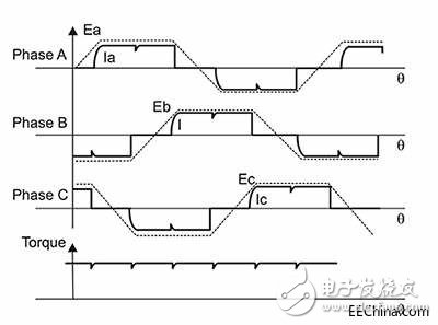 圖 2: 使用梯形控制的三相 BLDC 電機(jī)的電波形。 請(qǐng)注意,發(fā)生轉(zhuǎn)向時(shí)每個(gè)相位的驅(qū)動(dòng)電流輕微下降。 這會(huì)引起電機(jī)扭矩中的波紋。 虛線記錄了每個(gè)相位中反電動(dòng)勢(shì)的梯形圖,其中過零點(diǎn)與相位的浮動(dòng)周期中間點(diǎn)重合。