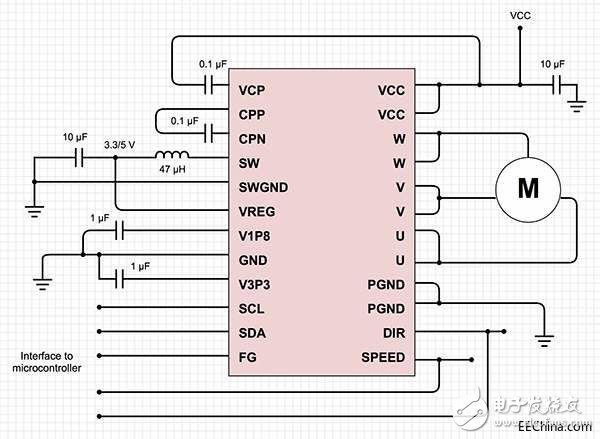 它利用 Kinetis KE04 ARM® Cortex®-M0 MCU 運(yùn)行正弦算法。 由于控制電路設(shè)計(jì)基于一種普通的 BLDC 驅(qū)動(dòng)器芯片,因此進(jìn)一步減輕了實(shí)現(xiàn)難度。 這些設(shè)備通常將 PWM 控制和電力電子器件集成到一個(gè)芯片,并提供外部 MCU 的接口。 其他設(shè)備集成 MCU,僅需一些額外的無源元器件就可以形成完整電路。