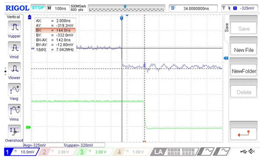 VIN(CH1), VOUT(CH2), VREF=320mV(保護(hù)閾值),NSI22C12保護(hù)延時(shí)實(shí)測(cè)144ns