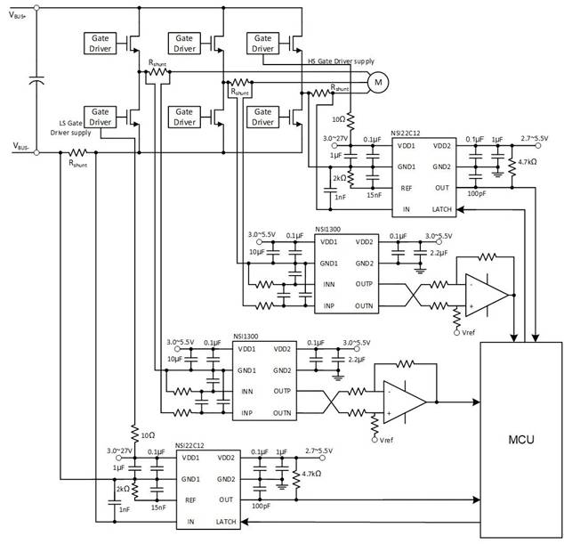 NSI22C12在電機(jī)驅(qū)動(dòng)系統(tǒng)中做母線/相電流保護(hù)典型應(yīng)用框圖