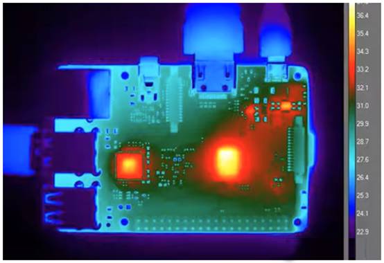 圖1:顯示重要熱源的PCB熱紅外圖像(圖源:Teledyne Flir)