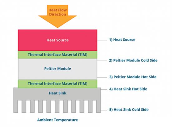 圖4所示即為熱源和散熱器之間的熱能流動。CUI Devices提供一系列標準型和微型珀爾帖模塊,可適應高達+77°C的溫度梯度。