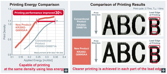 這些改進使得KR2002-Q06N5AA在使用單個鋰離子電池時,就能達到與傳統2節鋰離子電池(7.2V)驅動打印頭相同的打印速度和質量。與現有的單電池驅動熱打印頭相比,KR2002-Q06N5AA將打印所需的應用能量降低了約30%,實現了更高的能源效率,同時減小了熱敏打印機設備的尺寸和重量。