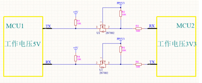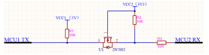 該電路從MCU2到MCU1方向,數據傳輸,達到了電平轉換的效果。